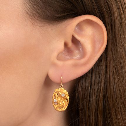 Sinuous blossoms, artfully sculpted in richly textured 18K yellow gold, sparkle with pairs of bezel-set European-cut diamonds in these ravishing Art Nouveau earrings (converted from cuff links) - circa 1900.