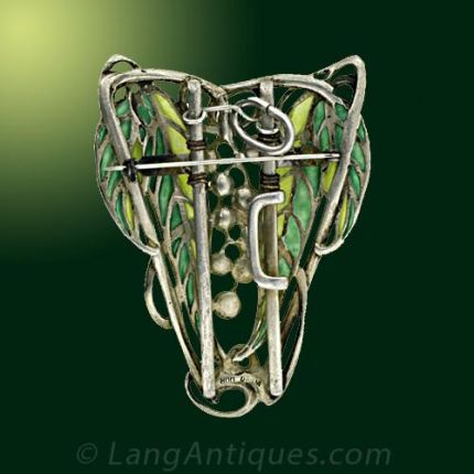Garnet grapes and enameled leaves hang together on this beautiful Art Nouveau pin/pendant. The pin has a graceful asymmetrical design and is constructed from 800 silver.