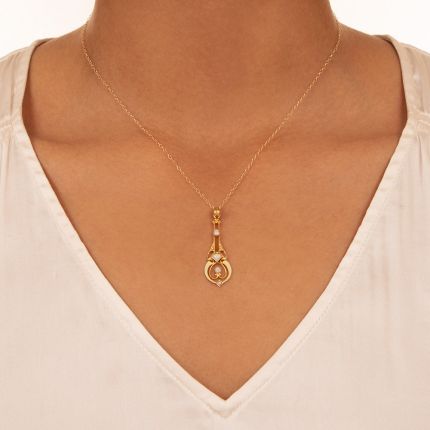 Shades of white--and gold. Delightfully delicate, this Art Nouveau pendant, its shape evocative of a 12th-century stringed instrument, is lightly crafted in 10K gold and is decorated with two freeform freshwater pearls, a single seed pearl, shimmering white enamel, and a white opal that glows with vibrant hues of green and orange. Lovely indeed. Hand fabricated, it suspends from a 16 1/2-inch chain.