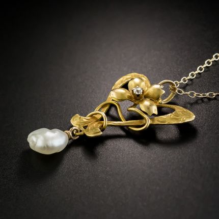 A highly stylized heart is intertwined by a sinuous diamond-dotted flower, all anchored by a dancing lustrous freshwater pearl in this 1 1/4-inch-long and lovely Art Nouveau pendant - circa 1900. The chain measures 16 inches.