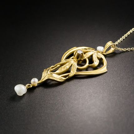 The classic sinuous curves and symmetry of Art Nouveau design are beautifully represented in this light and lovely pendant, accented with three lustrous baroque pearls and glittering at its center with a single diamond. Sweet. Rendered in 10K gold and measures 1 5/8 inches by 11/16 inch. Newer 14K chain measures 18 inches.