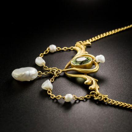 Dating from the heart of the delightfully distinctive Art Nouveau period - circa 1900 - this graceful treasure, hand fabricated in velvety 14K yellow gold, elegantly presents a bright and shining apple green Peridot supporting a swag of lustrous freshwater pearls. The original chain measures 14 1/2 inches.