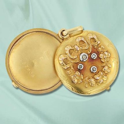 Precious 18K yellow gold Art Nouveau round swivel locket with a bow and floral garland motif and accented with four rose cut diamonds. This locket measures 1 3/4 tall by 1 1/4 wide.