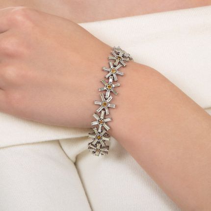 Fabulous, flirty, and fun. In this smashing estate bracelet, fifteen flowers (or starbursts)--sparkling with bright-white baguette diamond petals (or rays) and centered with shimmering golden yellow cushion modified brilliant-cut diamonds--link together creating a floral (or stellar) flash around your wrist. Total diamond weight, 11.34 carats. In platinum, it measures 7 1/4 inches.
