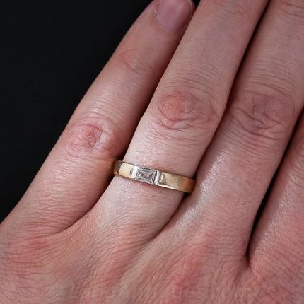 This sleek and slender band ring, of mid-twentieth century vintage, glistens with a horizontally set, quarter carat straight baguette diamond. Crafted in 18 karat yellow gold with a white gold diamond setting. 1/8 inch wide. A streamlined classic.