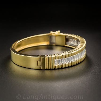 A chic, crisp and contemporary bangle bracelet, substantially hand-crafted in rich 18 karat gold, with 4.25 carats of ice-white, high-quality baguette diamonds glistening across the top in an elegant fluted design. A gorgeous everyday statement bracelet, fitted with a box clasp and safety hinge, measures 3/8 inches wide, fits a 6 3/4 inch wrist.