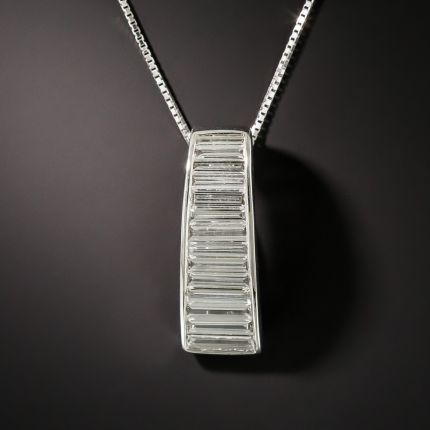 A gently curved and tapered stream of bright-white seamlessly-set baguette diamonds, together weighing 1.25 carats, create a fabulous flash in this sleekly styled pendant necklace, rendered in gleaming 18K white gold, measuring 7/8 inch.