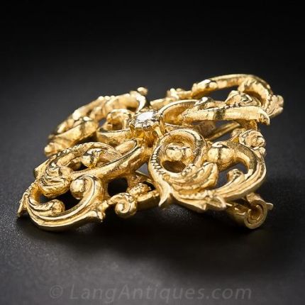 A single diamond sparkles from the center of sinuous interweaving scrolls, rendered in gleaming 14 karat gold, in this opulent adornment in the turn-of-the-twentieth century style. 1 1/4 inches across.