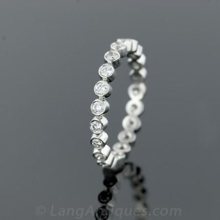 Platinum diamond eternity band featuring twenty one round brilliant cut diamonds set in individual bezel settings. Size 6 1/2. 2.0 mm wide. This band can be special ordered in your size. Special orders may take two to four weeks for delivery and price is subject to change.The Diamonds are described as follows:Twenty One Round Brilliant Cut Diamonds Weight: .70 carat total weight Color: G-H Clarity: SI