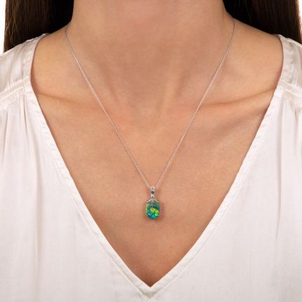 Like colorful peacock or hummingbird feathers preserved under glass, the glossy, glowing iridescence of this Australian black opal is a fabulous abstract work of Mother Nature's art. A swirling profusion of kaleidoscopic colors--electric greens, blues, yellows and orange--coalesce to create this intriguing, breathtaking jewel crowned with a diamond-set bale. In platinum. Chain measures 18 inches.