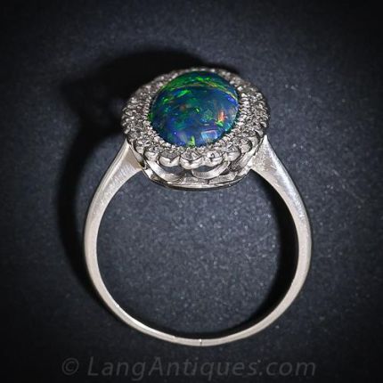 Ladies elegant black opal and diamond ring highlighting one 2.85 carat black oval opal cabochon with brilliant play of color wreathed by twenty eight round cut diamonds (.50 carat total weight, H-I color, VS-SI clarity) with a scalloped border.