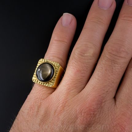 A bold fashion ring from the 1980's featuring a large, low-profile black star sapphire bezel-set in a rich and solid 18 karat yellow gold mounting with deeply grooved pattern on top.