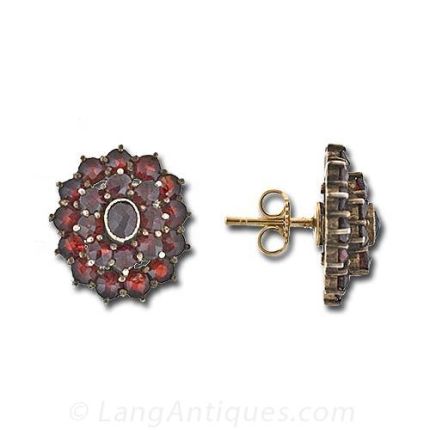 Adorable vermeil Bohmeian garnet cluster earrings with a central oval garnet wrapped with two rows of Bohemian garnets. Earrings measure 5/8 wide by 11/16 tall.