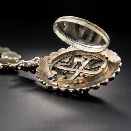 We don't see many Bohemian locket necklaces, and this one is exemplary. A glittering six-sided star overlays a large (1 5/8 by 1 1/4 inches) oval pendant equipped in the back with an open glass-covered display section. The locket suspends from a fancy bale leading to a 16 inch necklace composed all around of flower-shaped links. The entire pendant necklace glistens and glows with tightly pavéd, faceted red garnets. An enchanting adornment by way of turn-of-the-century Czechoslovakia (aka Bohemia). Crafted in gilded metal.