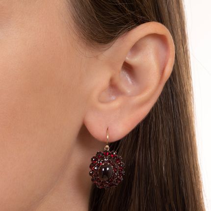 Long live Boho chic! In these classic Bohemian cluster ear drops, double-tiered halos of deep cranberry-red faceted garnets glimmer with fiery highlights around gleaming cabochon garnets. Circa turn-of-the-20th century by way of the Czechoslovakia. Crafted in gilded metal with 9ct. ear wires, they measure approximately 5/8 by 3/4 inch.