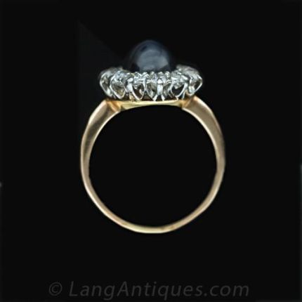 Turn of the century sapphire and diamond ring starring a 3.50 carat deep blue oval cabochon sapphire wrapped with old mine cut diamonds set in platinum atop a 14k yellow gold simple band. The Gemstones are described as follows: One Oval Cabochon Weight: 3.50 carats Twelve Old Mine Cut Diamonds Weight: 1.20 carats total weight Color: H-J Clarity: VS-SI