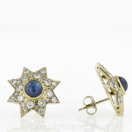 Deep royal blue round cabochon sapphires are bezel set in sparkling eight pointed diamond studded stars in 14 karat yellow gold. Effective. These earrings measure 3/4 inch.The Gemstones are describe as follows: Two Round Cabochon Cut Sapphires 2.00 carats total weight, Forty Eight Round Cut Diamonds 1.35 carat total weight, Color: H-J Clarity: SI2