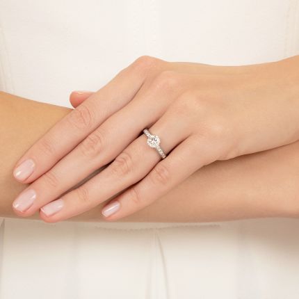 The essence of elegance and sparkle, this exquisitely restrained Cartier engagement ring shines with a supremely icy-white .96 carat round brilliant-cut diamond, and is supported by a company of diamonds that shimmer halfway down the shank. An enduring, classic beauty—just like your love. Total diamond weight, 1.26 carats. Currently ring size 6. GIA Diamond Grading Report states: D color, VVS2 clarity. Laser inscribed: Cartier C116296, 11618639.