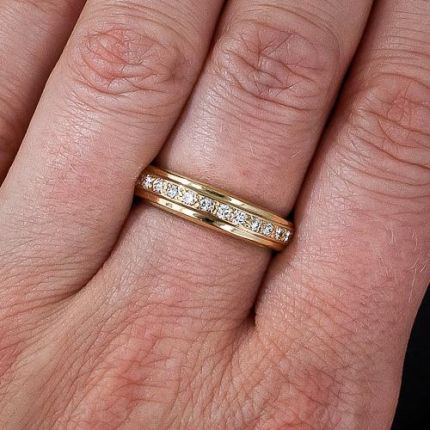 A slightly raised center row of bright-white full-cut diamonds sparkle two-thirds of the way around this beautifully modeled wedding band, crafted in rich 18 karat yellow gold by none other than Cartier of Paris, London, New York ... and everywhere else. Ring size 7 3/4.