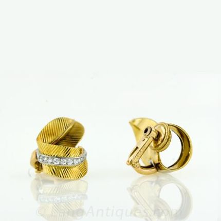 Elegant, eminently wearable earrings from the venerable French jeweler.Folded leaves in rich 18k yellow gold with a row of sparklers in the center ribs. Signed and numbered with assay marks. The earrings measure 1 X 5/8 inch.The diamonds are described as follows:Twenty-two Round Brilliant and Single Cut DiamondsWeight: 0.50 Carat TotalColor: EFClarity: VS - SI, Mostly VS