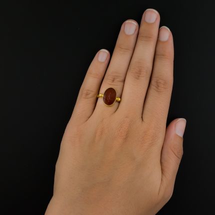 The Ancient History Encyclopedia describes Eros as, "...the Greek god of love, or more precisely, passionate and physical desire. Without warning he selects his targets and forcefully strikes at their hearts, bringing confusion and irrepressible feelings..." He is also the son of Chaos, which explains a lot. In this contemporary estate ring, Eros--engraved in a gold-framed carnelian-- is forever at hand and ready for romantic mischief. Crafted in 18K yellow gold, currently ring size 7 1/2.