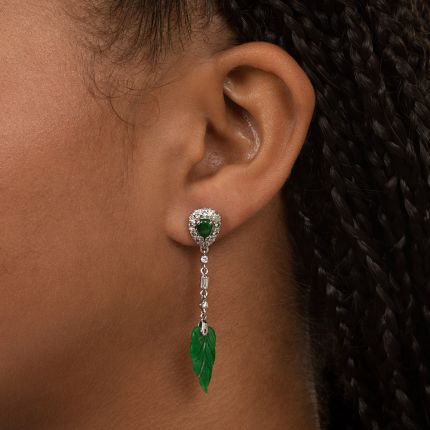 The first blush of Spring--bright green leaves fluttering in a fresh breeze announcing the beginning of a new season. The light and lovely, beautifully rendered carved jade leaves in these elegant estate earrings will flutter around your face, swinging freely from 14K white gold chains that glimmer with baguette and round brilliant cut diamonds, all suspended from posts set with pear-shaped jade cabochons twinkling all around with tiny round brilliants. Total diamond weight, .60 carat. Accompanied by gemological reports from Stone Group Laboratories stating: Natural. No Indications of Polymers or Dyes, Myanmar (Burma) - origin. They measure 2 inches long.