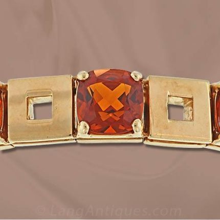 14K Yellow gold bright orange citrine bracelet featuring ten cushion cut citrines (27.50 carats total weight) alternating with square motif links. This bracelet measures 7 1/4 long by 3/8 wide.