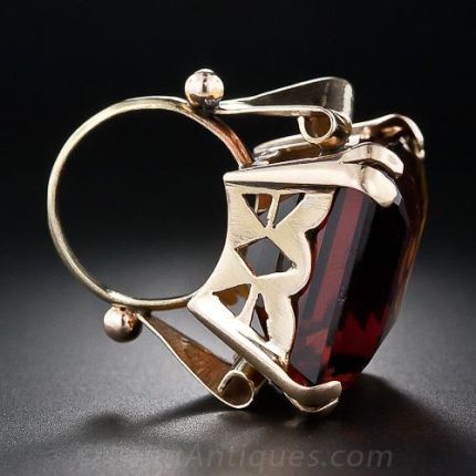 A bold and beautiful showstopper from the fabulous forties. A deep amber colored Madeira Citrine is magnificently enthroned in a geometric 18K yellow gold mounting with elaborate detailing. This wonderful Retro ring measures over 1 1/8 inch in length by 7/8 inch wide. Wow!