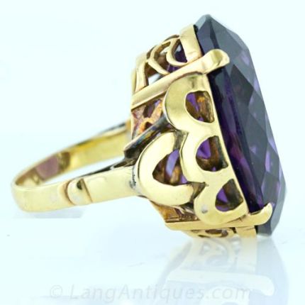 A vibrant, regal and deep-purple 38 carat amethyst is the star of this glamorous, early 1950s jewel. Beautifully crafted in gleaming 14 karat gold, with a graphic and cheerful double swag gallery, in a finger size 6 3/4. Measures _ inch by _inch