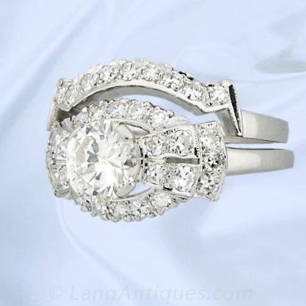 Platinum ladies diamond wedding set retrospective in style to the art deco period featuring one 1.22 carat European cut diamond (J color, VS2 clarity) centered in a bow motif accented with round cut diamonds and a diamond set wedding band (1 carat total).