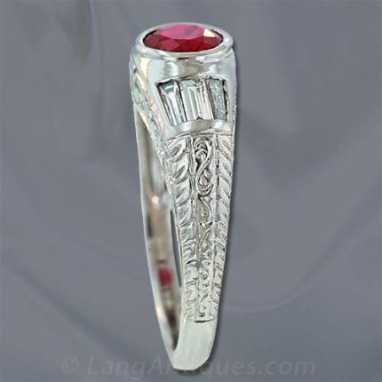Deco style platinum ruby and diamond ring featuring a sparkling .91 carat Burmese ruby bezel set and flanked by three tapered baguette cut diamonds (.35 carat total weight, G-H color, VS-SI clarity) on either side with a fancy engraved scroll motif on the gallery and shoulders.