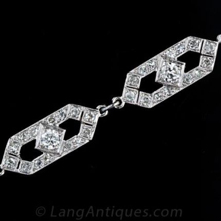 A simply delightful platinum and diamond bracelet from the 1920's. Composed of seven elongated hexagonal diamond links plus a matching clasp, modestly sized original Deco bracelets of this type are, for some reason, exceedingly rare to come across. A sweetheart!