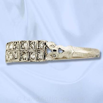 Platinum Art Deco ladies diamond wedding band featuring two rows of single cut diamonds (14 total, .12 carat total weight, G-H color, SI1-SI2) in square box head settings with milgrain and pierced details. This band measures 2-4 mm wide.