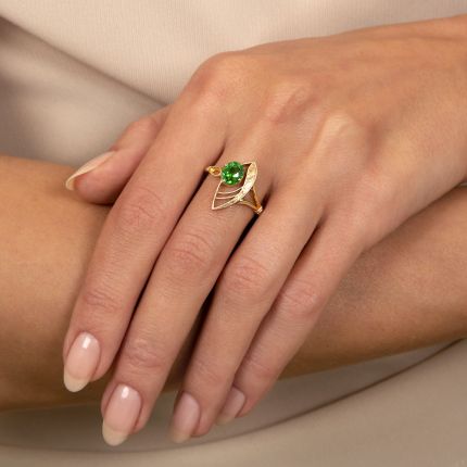 Beautifully reimagined, a vibrant, richly saturated apple green demantoid garnet from the Ural Mountains of Russia, weighing 1.10 carats, is asymmetrically presented in a very cool hand-engraved openwork marquise shape (formerly a stickpin dating back to the turn-of-the-20th century) atop a newly created ring shank. A captivating collectable. Hand fabricated in 18K gold, currently ring size 6 1/2. A lovely match with our necklace #90-3-12582.