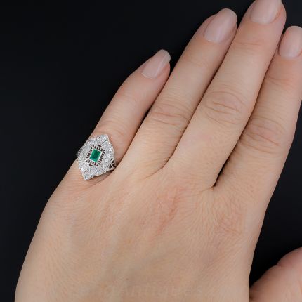 This late-Edwardian, early Art Deco Jewel can only be described as a graceful platinum delicacy. The central emerald is bezel set and framed with hand-fabricated linear wirework. The slightly elongated design resembles diamond-encrusted lace. Truly a special piece, although we feel it is a little too delicate for everyday wear. In a finger size 4 3/4.