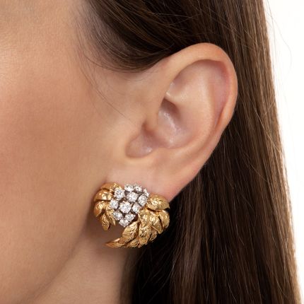 Sparkling clusters of high-quality, bright-white round brilliant-cut diamonds, totaling 2.40 carats, center gleaming golden leaves in these artfully sculpted ear baubles finely crafted in two-tone 18K yellow and white gold. Circa1970s-80s. They measure one inch in both directions.