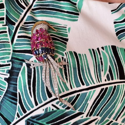 There was nothing low-key about the 1960s and this groovy brooch is proof of that. A full 3 7/8 inches from the top of its gold head to the bottom of its swirling diamond-set platinum tail (which, by the way, moves), this Bird of Paradise is finely feathered with bright crystalline red pear-shaped rubies and royal blue sapphires in a mix of pear and marquise shapes. No doubt, a pretty song emanates from his diamond-studded throat as he sits perched atop a diamond branch, surveying the scene with his emerald eye. We dig it. Designed and executed in the manner of Pierre Sterlé, but much bolder and colorful than the majority of comps we've seen. Total weight of 118 near-colorless diamonds, 3.35 carats; total ruby weight, 11.00 carats; total sapphire weight 5.25 carats. Hand fabricated in platinum and 18K gold.