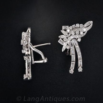 Glamorous vintage diamond drop earrings feature and array of both baguette and round cut diamonds set into a spray motif with cascading baguette cut diamonds. A big diamond splash!