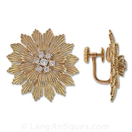 14K Yellow gold diamond starburst clip earrings sparkling with seven round cut diamonds (.45 carat total weight, G-H color, SI clarity) in each earring. These clip earrings measure about 1 round.