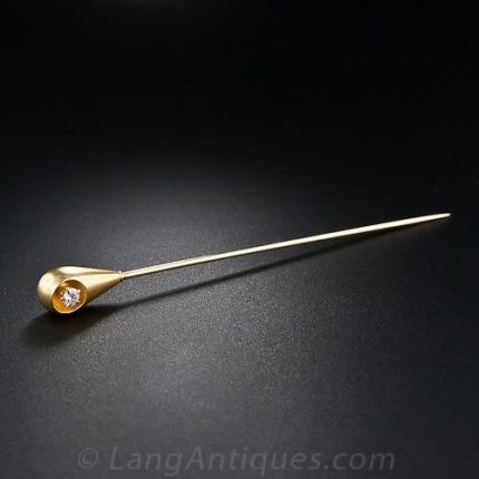 A very cool early twentieth-century stick pin sparkling with a single European-cut diamond inside a stylized tear drop motif. American maker's mark on the reverse. 2 13/16 inches.