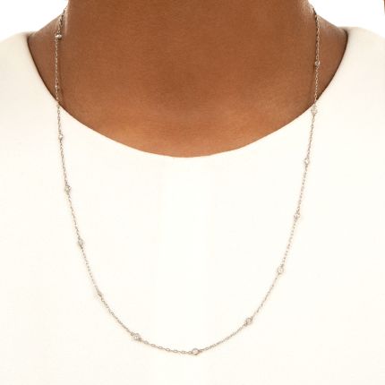 Create a cascade of sparkling diamonds around your neck with this chic and always in vogue diamonds-by-the-yard necklace. The 20-inch cable chain is punctuated with 20 European-cut diamonds that gleam like tiny dewdrops. A whisper of platinum and light to grace your neck as a stand-alone beauty, or as part of an ensemble cast of other necklaces. Total diamond weight, 1.10 carats. Crafted in platinum