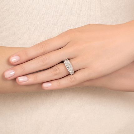 Mirror-image rows of seamlessly-set, icy-white baguette diamonds, all together weighing .73 carat (but appearing twice the weight), create a double sensation of scintillation across your finger, in this chic and stunning double-band ring. A tantalizing twofer. Rendered in gleaming 18K white gold, currently ring size 6 1/2.