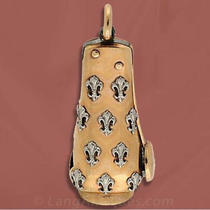 Early 20th century 14K rose gold cigar cutter with white gold fleur de lys motif appliqués. This cigar cutter measures 1 1/2 tall by 5/8 wide.