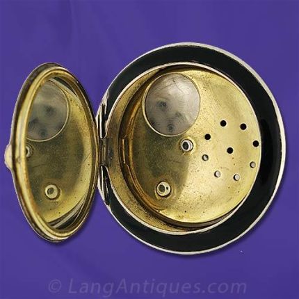Powder your nose in style with this early Art Deco silver ladies compact. This compact features a beautiful purple guilloche enameled top with scrolling silver inlay and black enameled trim. The compact opens to reveal a small mirror and has a fully enameled bottom in purple as well. This trinket measures 2 1/8 round.