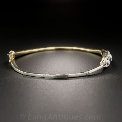Hallmarks tell us this lovely early-20th century bracelet hails from a somewhat exotic locale - Budapest between the years 1902 and 1922. The central plaque has a sparkling array of European-cut, rose-cut and antique single-cut diamonds intersected by a bright raspberry stripe of calibre-cut synthetic rubies (an exciting innovation at the time). A classic and very pretty antique platinum-topped gold articulated bracelet, with a hint of the Art Deco modernity to come. Measures 7 1/4 inches long by 1/4 inch wide. With Austro-Hungarian and Budapest hallmarks.