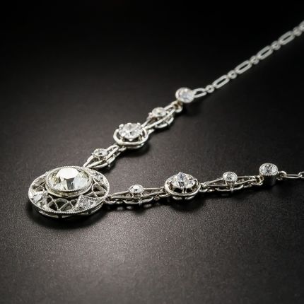This classic beauty from the Edwardian period, delicately hand fabricated in platinum - circa 1910, sparkles front and center with a bright and shining European-cut diamond, weighing 1.15 carats. The scintillating stone is enveloped in a lacy circular setting suspended by a distinctively designed diamond-studded necklace. Rare, radiant, and ravishing. 16 inches, 1.85 carat total diamond weight.