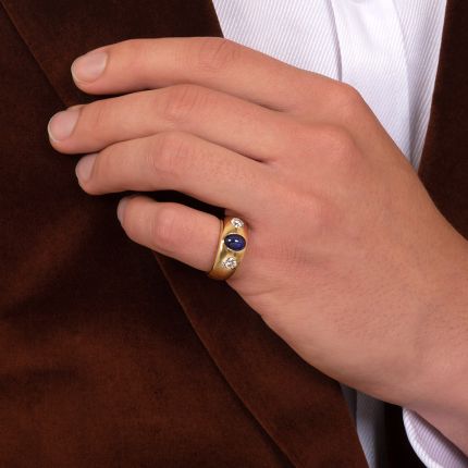 From the early 20th century, this classic three-stone ring—bold and substantially hand fabricated in rich, buttery 18K yellow gold—centers a 2.35 carat royal blue, oval cabochon sapphire accompanied, in sparkling contrast, by a pair of bright European-cut diamonds. Sumptuous and weighty, the ring is designed and crafted for a very comfortable fit. Total diamond weight, .80 carat. Currently ring size 8 1/4. Sapphire accompanied by a GIA gemological report stating: No indications of thermal enhancement. Cambodian origin.