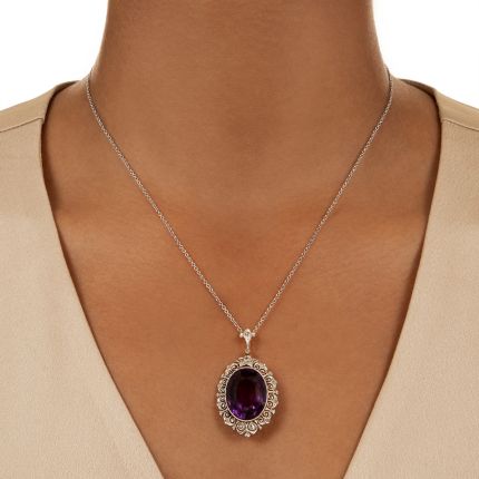 Purple and roses—how pretty! This Edwardian delight captivates with a luscious 16.00-carat bright purple amethyst set in a lacy platinum over 18K gold frame dotted with twinkling rose-cut diamonds. The cheery neckline brightener connects to a fancy diamond-set bail and suspends from an 18-inch platinum cable chain. Total diamond weight, .28 carat. Hand fabricated.