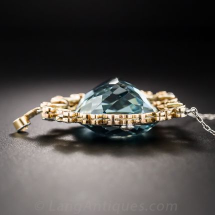 Feminine Edwardian-era artistry, rendered in platinum over 18K gold and sparkling old mine and rose-cut diamonds, frame a lustrous, liquid sky blue cushion-cut aquamarine, weighing 27 carats, in this truly exquisite lavaliere necklace - circa 1910-1920. All original and perfectly sublime. 1 1/2 by 1 1/4 inches, the original platinum chain measures 14 inches.