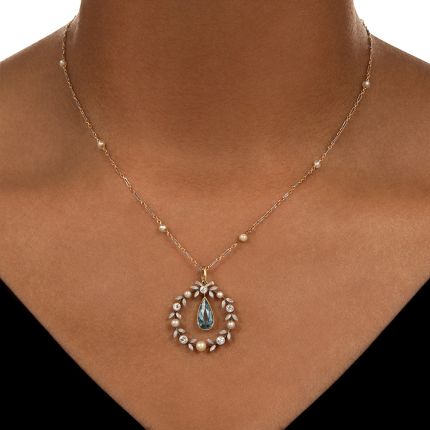 Lustrous white natural pearls, lively bezel-set European-cut diamonds, and slender hand-engraved platinum leaves form an elegant wreath around a glimmering 1.20 carat pear-shaped sky-blue aquamarine in this elegant Edwardian necklace. The airy and alluring composition suspends from a complementing 16-inch pearl-accented cable chain. Enchanting. Total diamond weight, .25 carat. Hand fabricated in platinum and 18K yellow gold, circa 1900.